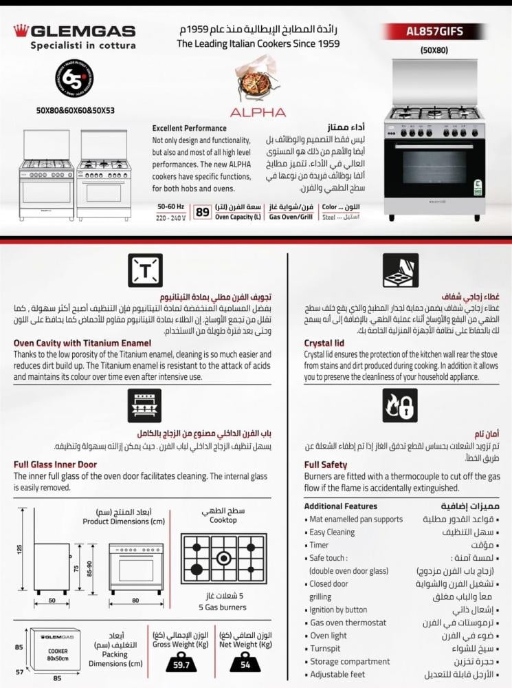 مواصفات فرن جليم غاز 50*80 5 عيون امان كامل ستيل AL857GIFS: