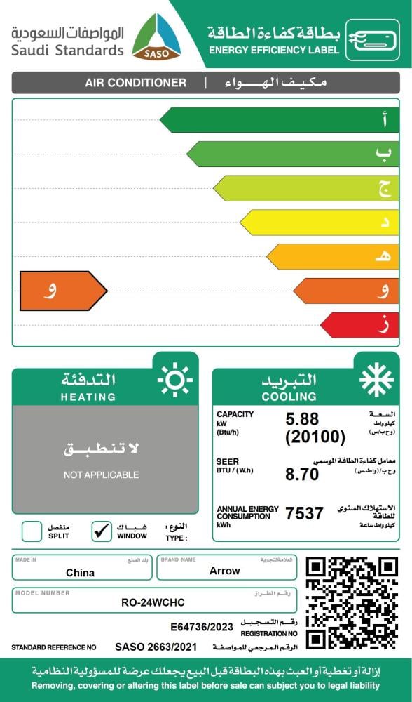 مواصفات مكيف شباك ارو 24 بارد RO-24WCHC